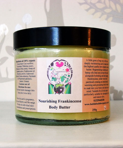 Coco nucifera (coconut Butter), Thebroma cacao (Cocoa Butter),Rosa rubiginosa (Rosehip Oil), Cannabis Sativa(Hemp Oils), Boswellia Carterri (Frankinscence Oil), Cedrus Atlantica (Cederwood Oil), Pogosteman Patchouli (Patchouli Oil), Linalool, Geraniol