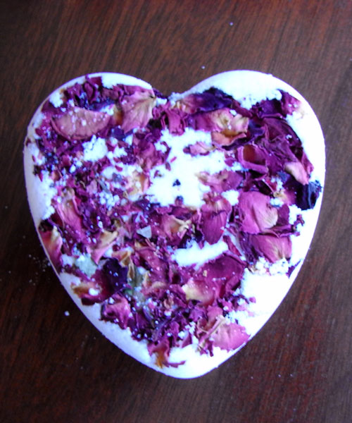 Ingredients: Bicarbonate of Soda, Citric Acid, Thebroma Cacao (Cocoa butter), Canaga odorata (Ylang Ylang oil), Vanilla planifolia (Vanilla oil), Citrus nobilis (Mandarin oil), Rose petals. Contains nut butter.